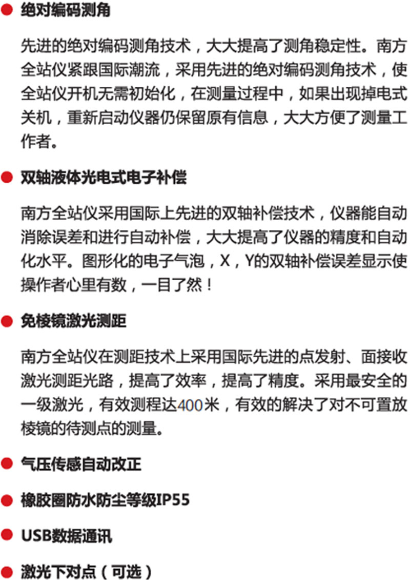 南方332R系列全站仪采用激光测距,绝对编码及双轴补偿新技术,极大降低障率,提高半岛(中国)一站式服务平台作业效率,对所有的相关零件都进行了重新设计和改进,防水,防尘,防潮等问题彻底解决,