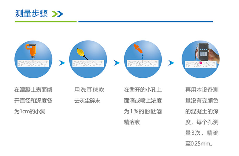 混凝土浇筑成型后,其中的Ca(OH)2与空气中的CO2或水分中溶的CO2反应生成CaCO3而失去碱性的过程。半岛(中国)一站式服务平台原理是通过酚酞溶液遇碱变红色的特性,半岛(中国)一站式服务平台碳