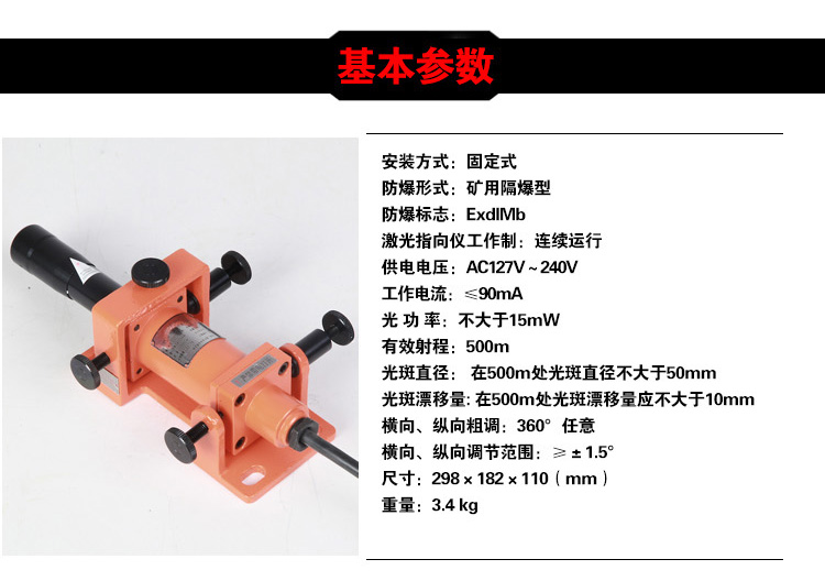 YBJ矿用隔爆型激光指向仪是集电子、光学、精密机械等技术为一体的仪器。具有外形美观、体积小、重量轻、防爆等特点。仪器安装采用固定式,可快速固定在锚杆上。仪器可在360°范围任意粗调,微调准确;调节方便,制动可靠。产品采用自主研发的光学系统,可采用红、绿两种光源,光斑大小、射程满足矿下施工需求。仪器采用交直流转换电源模块,交流宽电压AC80V~AC245V供电,具有保护功能。